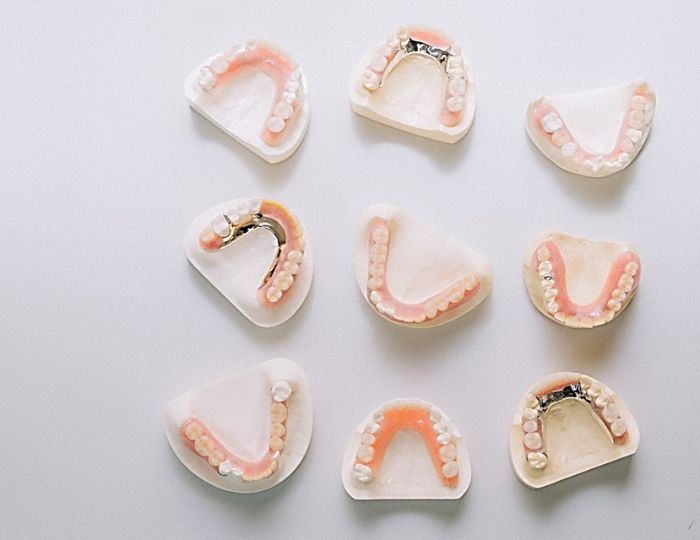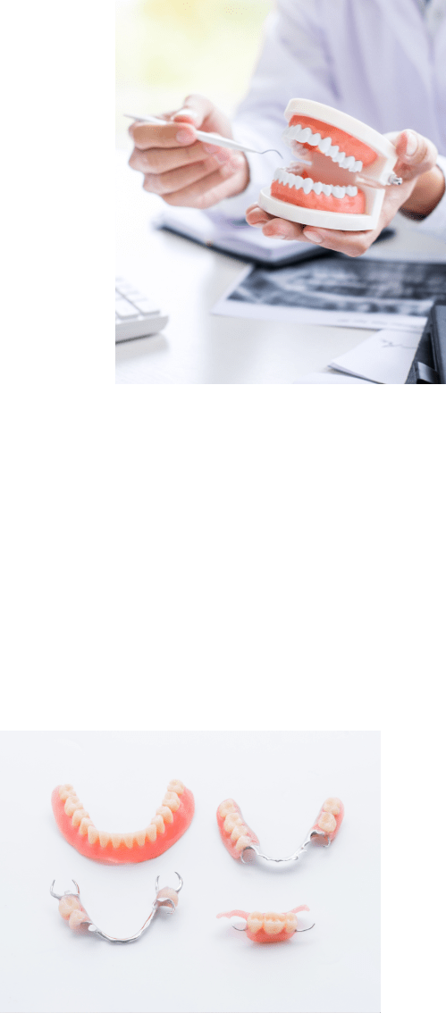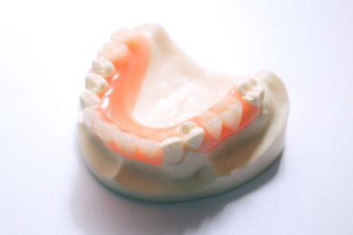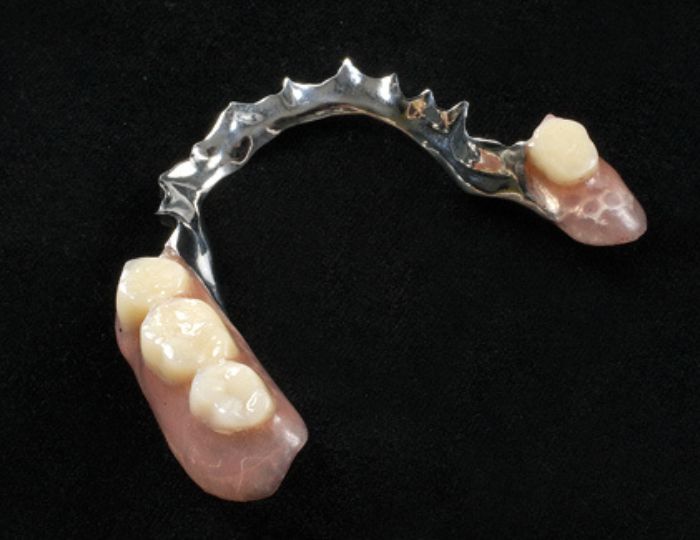 取り外しできる入れ歯。軽い金属フレームで安定を図った設計が用いられることがあります。